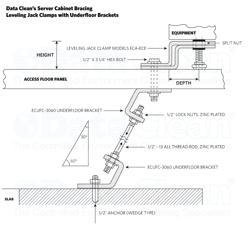 Height is the measurement from the floor to the underside of the server rack or cabinet. Depth is the measurement from the front of the server rack or cabinet to the center of the leveling jack.